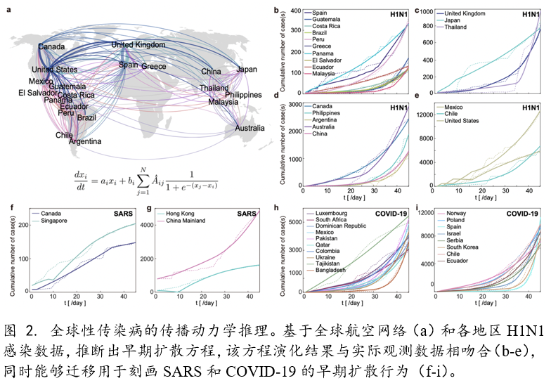 该算法框架具有很强的鲁棒性,能够对抗观测数据中的缺失边、伪连边、观测噪声、关联噪声、内禀随机性等不确定性,在宏观行为同步较强时仍然能够实现推理。与以往针对单个体或少量个体的智能推理方法相比,该研究提出的方法能够在更复杂、非正交项空间中进行搜索,而且在针对数据不确定性的5个模型系统测试中均表现更优。该框架也被应用于推理全球性传染病的传播动力学(图2),算法基于H1N1传播数据,发现了用于描述早期传播过程的简洁的常微分方程,该方程同时能够刻画SARSCOVID-19的早期传播行为,验证了方法的有效性和普适性。