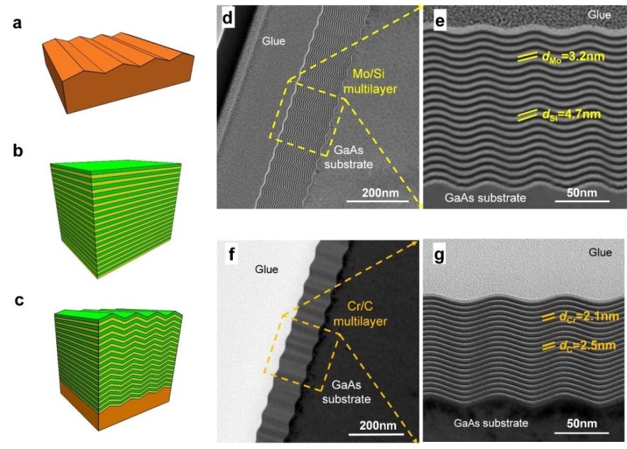制备Mo/Si (d, e)和Cr/C (f, g)多层膜光栅的截面TEM图。