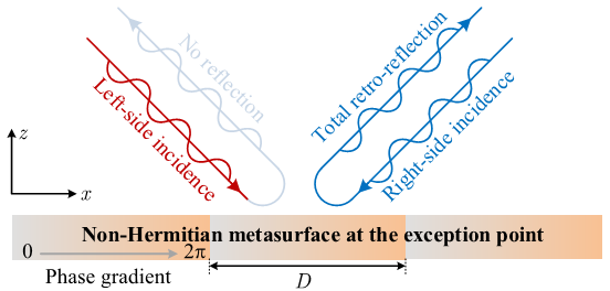 图1 非厄米声学超构表面示意图,在奇异点处可实现极度非对称反射。