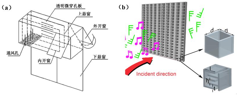 图1. (a) 传统通风隔声窗示意图; (b) 超构设计的通风隔声窗示意图。