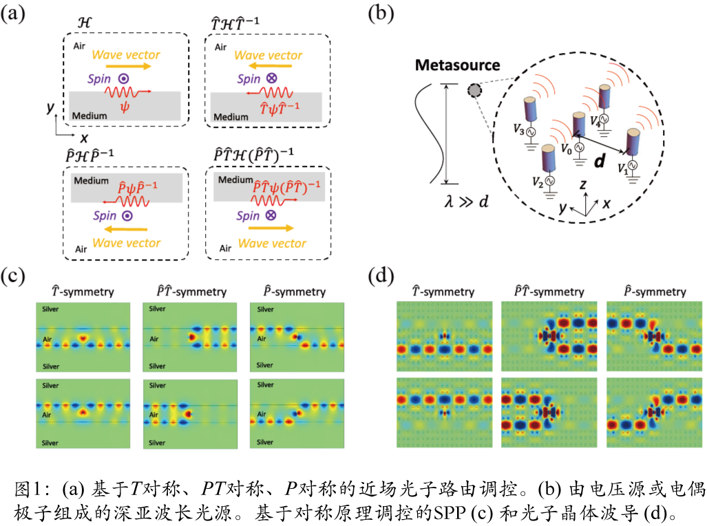 对称性是物理学中含义最深刻的概念之一。该研究揭示了对称性在近场光子学中的重要性。近场光子学因其从经典领域到量子领域的广泛应用而备受关注,目前已经成为信息通信和能量传输的重要桥梁之一。论文从理论和实验上研究了基于时间反演(T)对称、宇称-时间反演(PT)对称、宇称(P)对称的近场光子路由调控,如图1(a)所示。从对称性出发,可以设计一种仅由电压源或电偶极子组成的光源(如图1(b)所示),从而克服传统光源需要磁偶极子的局限性。论文中提出的基于对称性的近场光子路由调控原理具有普适性,可应用于SPP(图1(c))、光子晶体波导(图1(d))、介质波导等各种波导系统中,为将来集成光学与光子学器件的研制提供了新机理。