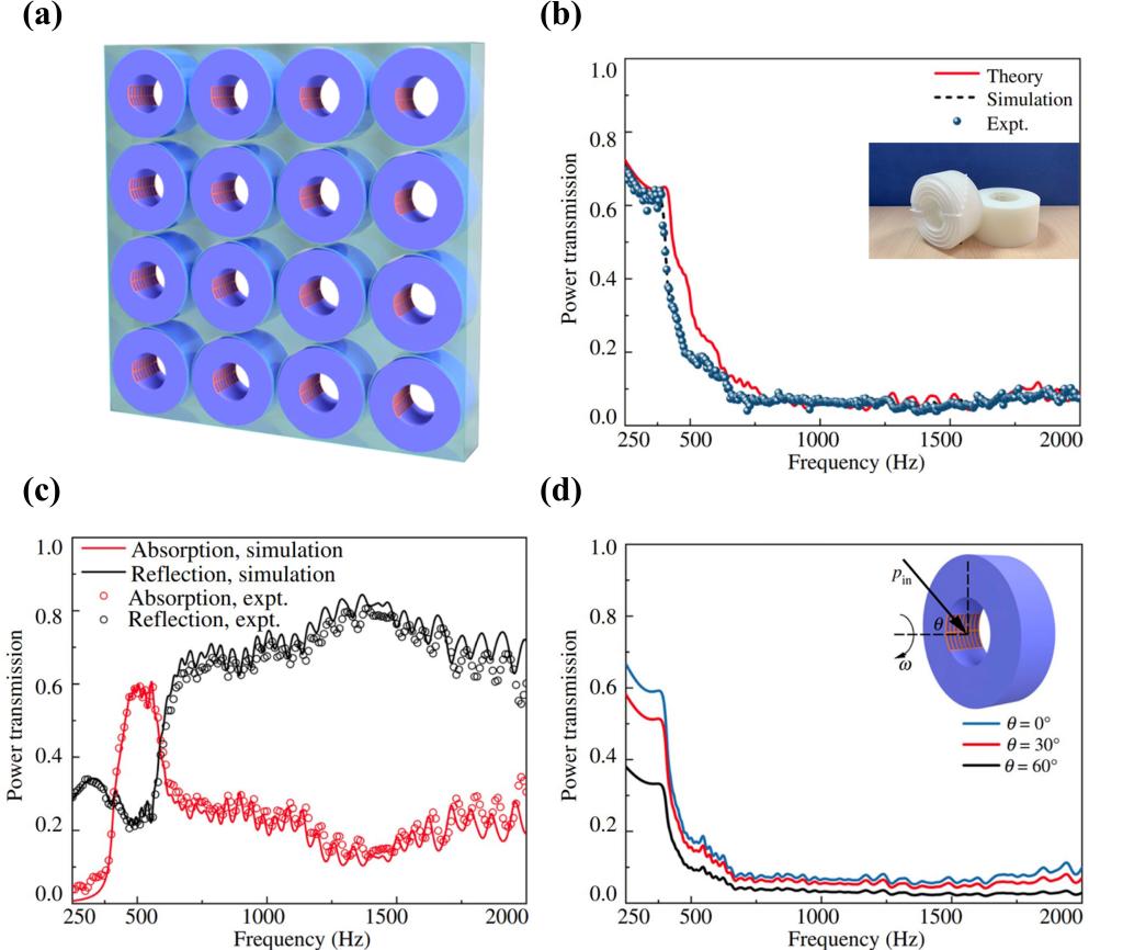 在经典波物理中,如何在阻挡波传播的同时允许介质的自由流动是一项极具挑战性的工作,具体到声学中,就是通风隔声屏障问题。现有超构通风隔声窗基于局域共振或类法诺共振机理,工作频带局限在共振频率附近较窄的范围内。研究团队在2020年基于系统表面响应理论有效拓宽了超构通风隔声窗的频带,但有效工作带宽仍只有约一个倍频程 [Phys. Rev. Applied 13, 044028 (2020)]。为了在有效通风的前提下实现超宽带隔声,研究团队进一步结合耗散机理和干涉机理(下图c),提出了具有复合功能的超构声学单元,实现了多角度入射条件下的具备自然通风的宽带隔声窗设计(下图d),在两类机理协同作用下,其工作频率范围达到两个倍频程以上(650-2000 Hz)。该研究的成果不仅有望为绿色建筑噪声控制问题提供解决方案,这种兼顾开放空间和宽带特性的声学超结构功能器件在航空、交通及环境等领域也具有巨大的应用前景。