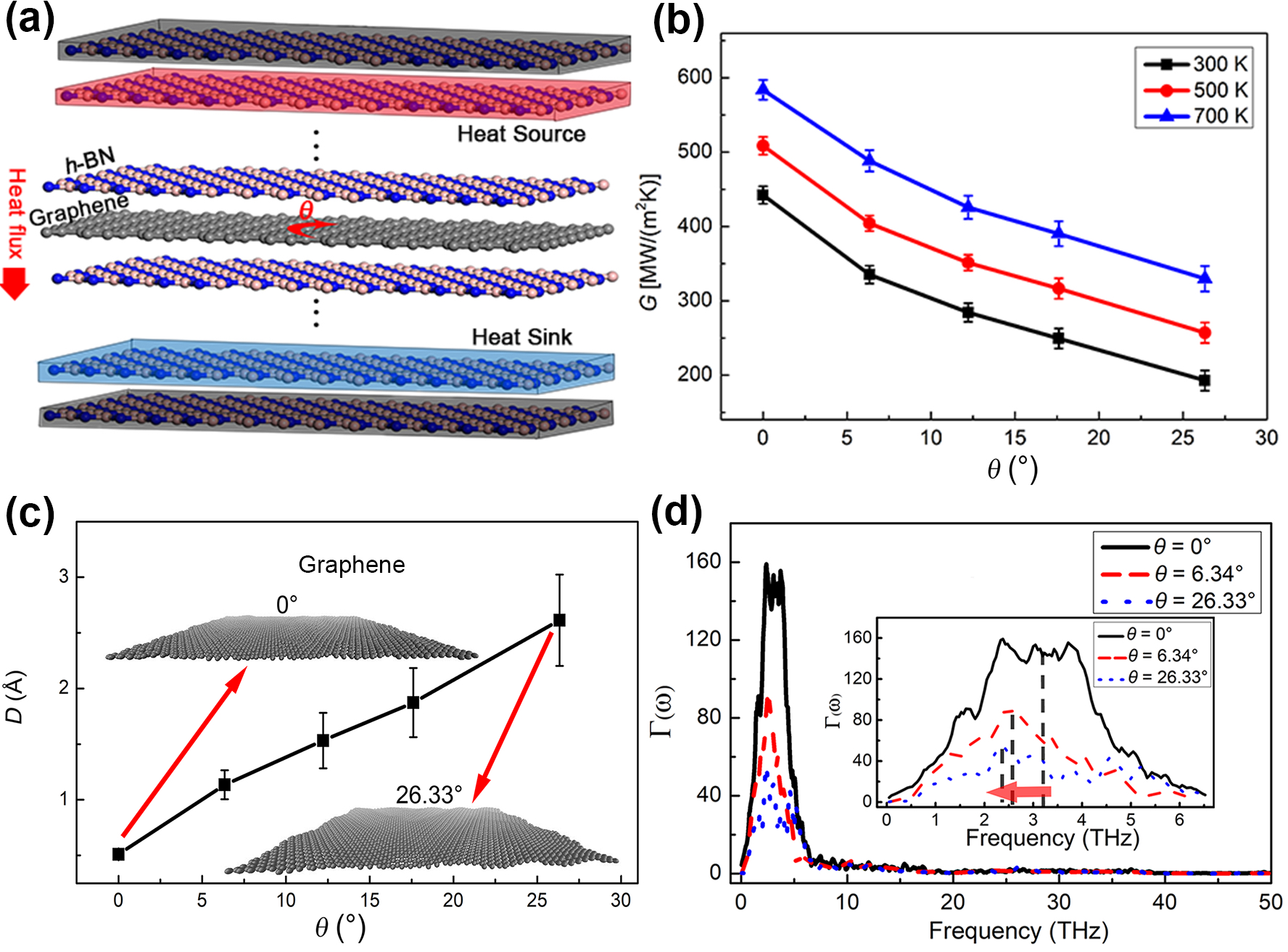 图(a) Graphene/h-BN范德华异质结和模拟设置示意图;图(b) 界面热导随层间旋转角度的变化关系;图(c) 不同旋转角度下石墨烯层的表面起伏;图(d) 不同旋转角度下对应的界面声子透射谱。