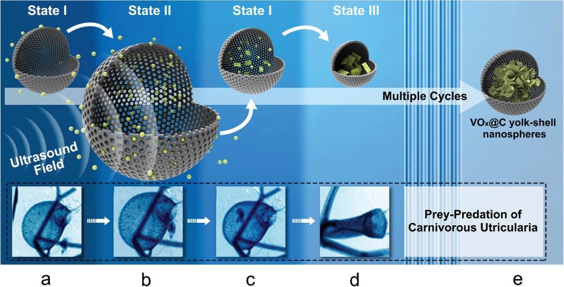 研究团队发现介孔碳壳(HMCS)具有高固有频率和优越的机械性能,在超声驱动下保持其完整性并会快速非对称地膨胀和收缩,在球壳的内外产生周期性的巨大压力差。同时氧化钒纳米颗粒与碳壳介孔孔道之间的相对运动会产生阻尼力,非对称膨胀收缩过程使得纳米颗粒进入碳壳的阻尼力要比它们逃逸时小。因此与自发热力学过程相反,在超声能量持续输入下,介孔碳壳主动将氧化钒纳米颗粒逆浓度梯度封装到壳内,合成了VOx@C 卵黄壳纳米球,实验和数值计算表明该过程与狸藻的捕食过程一致。此外,通过对超声驱动过程的调控,可以实现材料在碳壳表面或内表面生长。