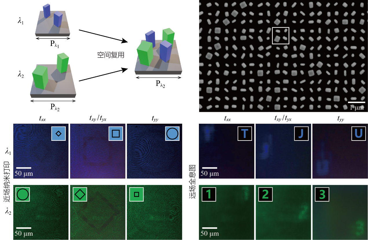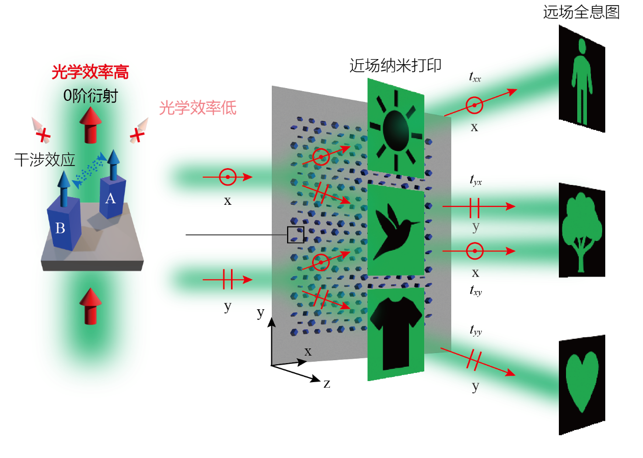 相位、振幅、偏振是单色光场的三个基本自由度。光学器件对单色光场的调控作用可以用一个2×2的琼斯矩阵来表示,琼斯矩阵的每个分量均代表特定偏振态组合的传输系数,由振幅通道和相位通道组成。琼斯矩阵的可控通道数目的多少,不仅标志着光学器件对电磁波的调控能力的强弱,也限制着最终可实现的光学功能的复杂程度。随着现代光学技术的发展,需要光学器件能加载尽可能多的琼斯矩阵通道,以实现诸如偏振切换成像、光学加密、信息编码等复杂光学功能。然而,这些功能有些无法用棱镜、透镜等传统光学器件实现,有些则需要多个传统器件级联,不利于光学系统的小型化、集成化。