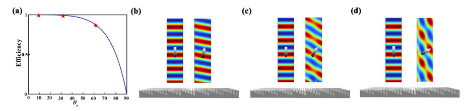 图1.(a)正入射条件下胞内单元独立设计的梯度相位超表面的反射效率与反射角的关系,梯度相位超表面在正入射条件下反射角度从(b)15°,(c)30°,(d)45°的声场分布表明梯度相位超表面受传统局域设计影响效率随着反射角度的增大而减小。