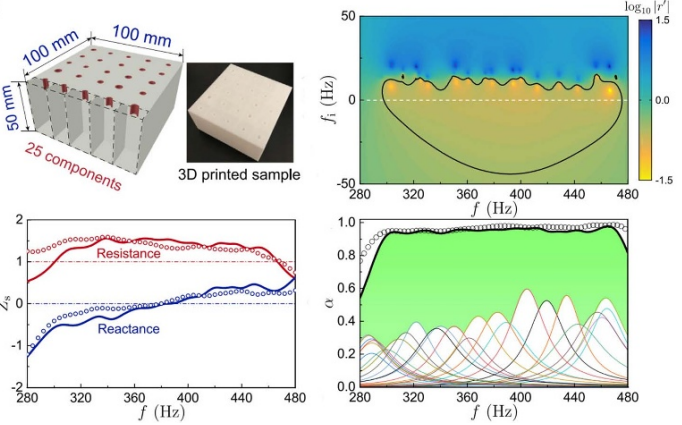 图3.非局域耦合宽带吸声体,通过非局域耦合25个弱吸声单元实现350Hz-480Hz范围内阻抗的匹配以完成高效吸声(平均吸声系数0.93)。