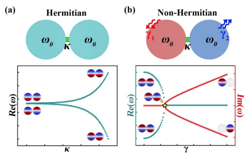 图2.(a)厄米声学双腔系统的特征频率与腔体耦合之间的关系。(b)非厄米声学双腔系统在腔体耦合一定的情况下特征频率与腔体内增益和损耗之间的关系。随着非厄米特性的引入声学系统拥有了更丰富的可调性。