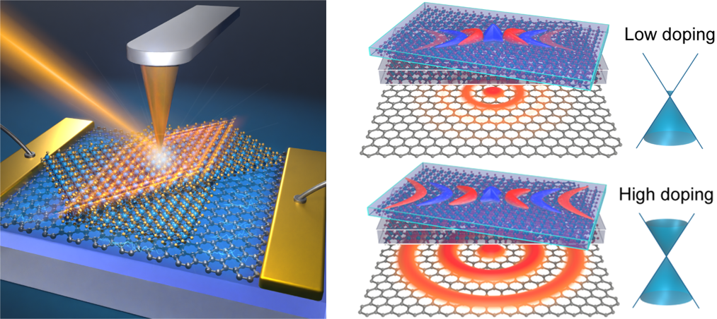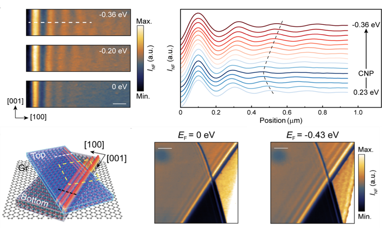 搭建的散射型扫描近场光学显微系统(s-SNOM),对α-MoO3声子极化激元随石墨烯费米能级变化的传播行为进行了系统性研究,并发展了相应的理论模型,揭示了转角α-MoO3声子极化激元的电学调控物理机制。该研究成果以“Gate-Tuning Hybrid Polaritons in Twisted α-MoO3/Graphene Heterostructures”为题发表在《纳米快报》(Nano Letters)上。