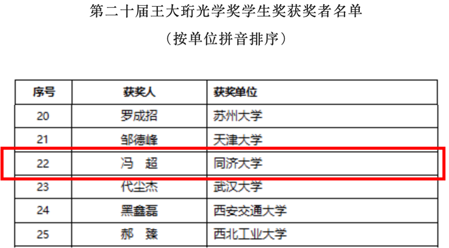 在12月24日召开的第二十届王大珩光学奖评审会上,评审专家对38所高校及科研院所初评产生的40名学生奖候选人进行终评,最终选出学生奖获得者30名。爱爱视频 2021级博士研究生冯超榜上有名。