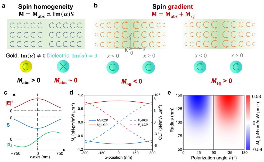 为了挑战上述持久的理解,王占山教授和程鑫彬教授团队的施宇智教授联合台湾成功大学的吴品颉教授提出了一种生成光力矩的新机制,其中光力矩完全来自于自旋角动量(SAM)。通过将圆偏振光聚焦,得到了自旋分布不均匀的自旋梯度场(图1b),光强度和SAM幅度都从光束中心(x=0)衰减(图1c),这导致了置于光场中的介电球上的Poynting矢量分布不均匀,从而引起了自旋梯度光力矩的生成。研究结果显示,与横向光力(OLF)不同,对于给定的光偏振,自旋梯度光力矩的符号保持一致(图1d)。同时,自旋梯度光力矩的符号也不受颗粒尺寸变化的影响,与光偏振呈正弦关系(图1e)。
