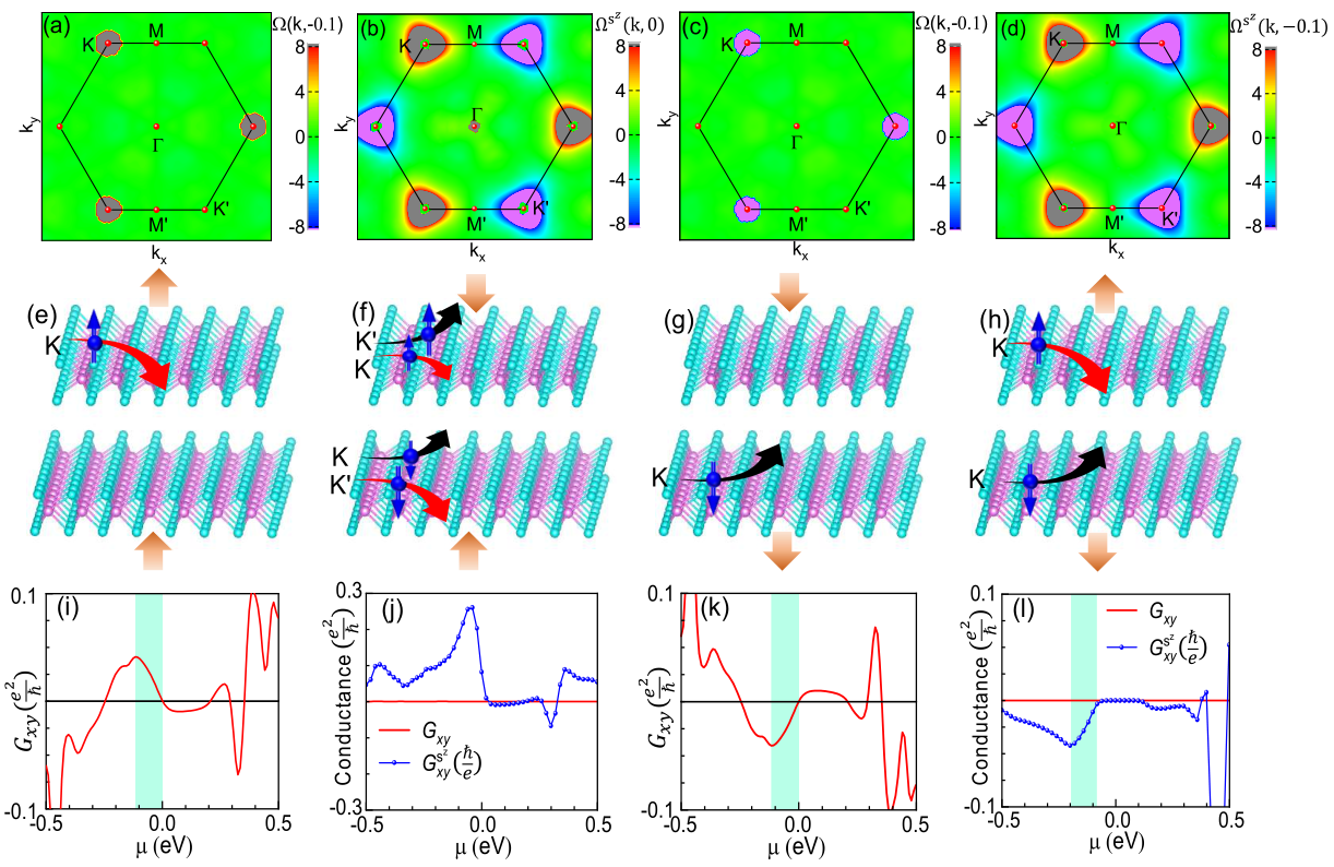 图3、四个构型的(自旋)贝里曲率(上行)、霍尔效应示意图(中行)(自旋)霍尔电导(下行)