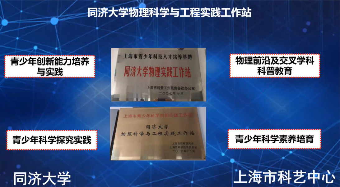 的支持下,形成了依托物理学院的一线教授对物理科学前沿和交叉学科进行科普的教育平台、科普师资团队进行青少年科学素养培育的教学模式、对物理工作站的学生进行科学探究实践的科创活动以及围绕青少年创新能力培养与实践为主要目标的相关活动。围绕这四个方面,同济物理工作站开展了大量的工作,并通过图片展示了以往活动内容。