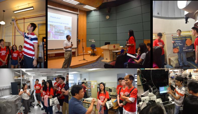 在访问香港大学(港大)期间,物理学系系主任Quentin Parker教授、谢茂海教授和多名师生与我们交流。Parker教授首先对港大物理学系的基本情况、科研方向、学生培养和教学理念等方面做了全面介绍,通过茶歇形式让两校师生们相互联系、自由交流。师生们分组参观了表面物理实验室、核物理实验室、锂电池实验室和天文教研室,谢茂海教授、李晓菁副教授、李启明博士等教师为我们热心讲解(图1下左、下中和上右)。学生们不仅与科学家们进行了面对面的交流,还在现场观测了太阳黑子,收获颇丰。最后,姚望副教授和Jeremy Lim副教授分别作了凝聚态物理理论和天体物理方面的学术报告,并与在场师生进行讨论。香港大学的教育理念、重大科学问题研究和育人理念让人印象深刻。