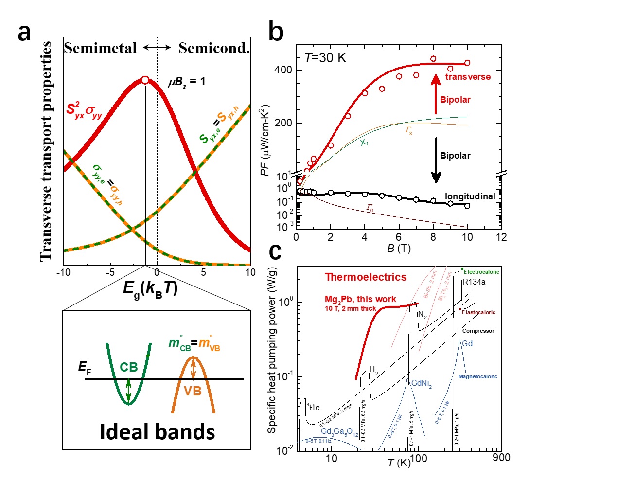 图2 a 图解双极扩散效应增强横向热电性能的理想电子能带结构。b 半金属Mg2Pb中纵向和横向热电功率因子(PF)的磁场依赖。c 对比不同制冷技术的比制冷/热泵功率及其温度依赖。
