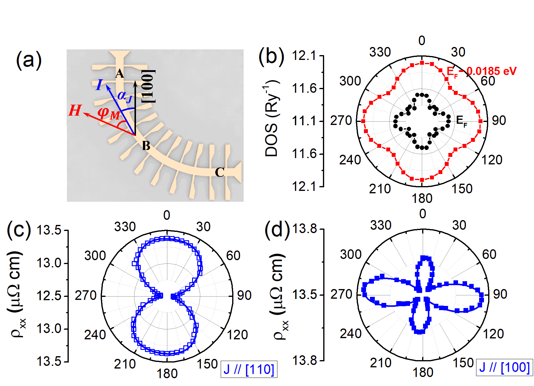 图1. (a)单晶铁铂有序合金的各向异性磁电阻测量示意图。(b)自旋轨道耦合作用下费米能附近态密度随磁矩方向的变化。当电流沿[110]