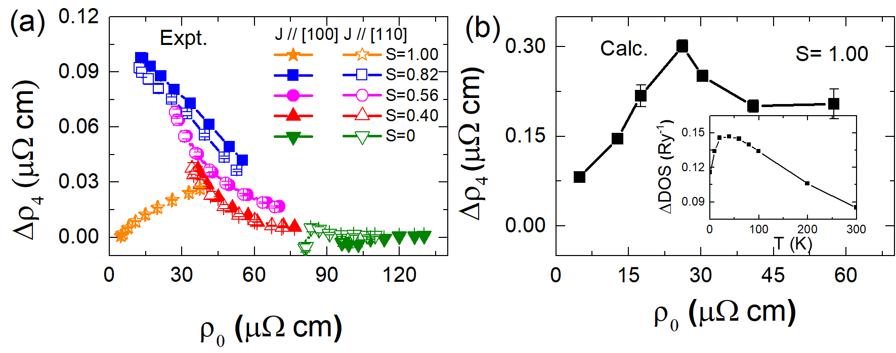 图2. (a) 实验测量四度对称各向异性磁电阻。(b) 理论计算完全有序铁铂合金的四度对称项随电阻率的变化。插图表示有限温度费米面态密度的各向异性。