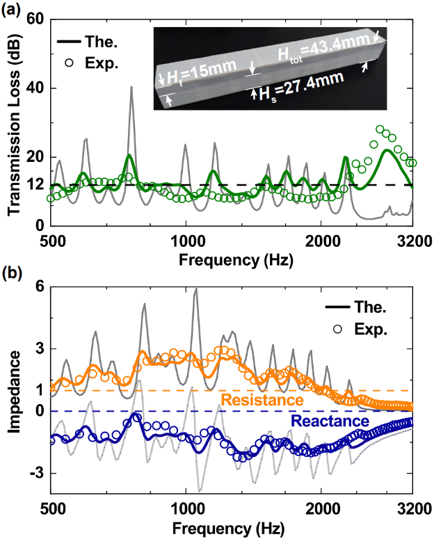 图4声衰减效率可控的超构消声器。(a)超构消声器的理论和实验的TL。插图为实验样品图。(b)超构消声器的理论和实验的声阻抗。