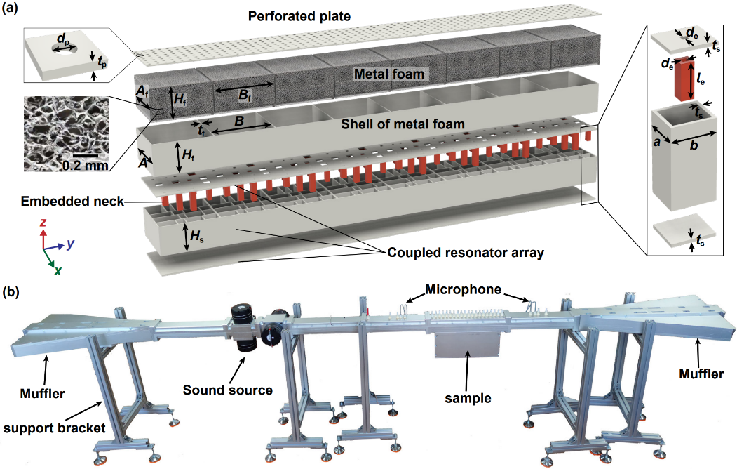 图 1(a)超构消声器示意图。(b)声波导管实验设备。