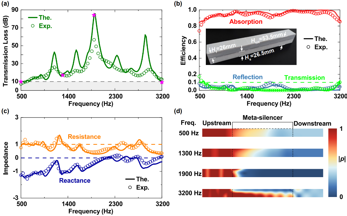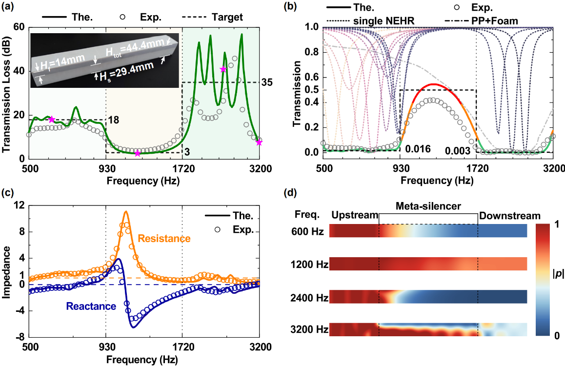 图 5可设计音色的超构消声器。(a)超构消声器理论和实验的TL。插图为实验样品图。(b)超构消声器在声波掠入射下的理论和实验的透射系数。(c)超构消声器的理论和实验的声阻抗。(d)超构消声器声压幅值|p|的理论结果。
