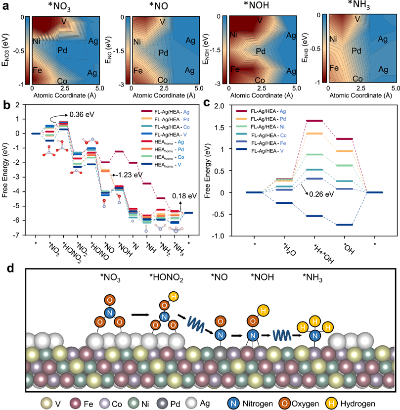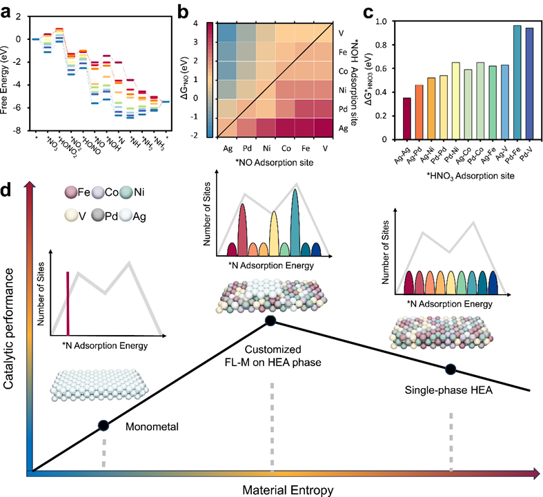 图1.该研究目的。a NitRR在不同单金属上的反应自由能。b HEAhomo中不同金属位点组合下*NO加氢的自由能变化(∆G*NO)。c HEAhomo中不同金属位点上*NO3加氢的自由能变化(∆G*HNO3)。d 随着材料熵的增加,设计的单金属、HEAhomo和定制的FL-Ag/HEA催化剂的电催化活性对比。