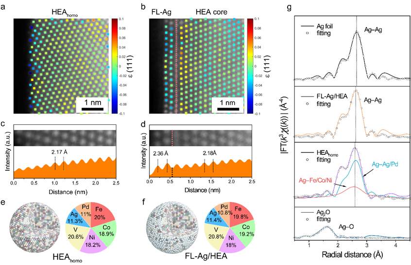 图3. 原子结构分析。利用统计参数估计理论推导出的a HEAhomo和b FL-Ag/HEA中(111)平面的原子分辨应变图。用红色虚线标记纳米界面。c HEAhomo和d FL-Ag/HEA NPs中(111)平面对应的强度分布图。e FL-Ag/HEA和f HEAhomo的三维模型及其组成元素的原子百分比。g FL-Ag/HEA/CNFs、HEAhomo/CNFs、Ag和Ag2O箔的FT-EXAFS和相应的拟合光谱。